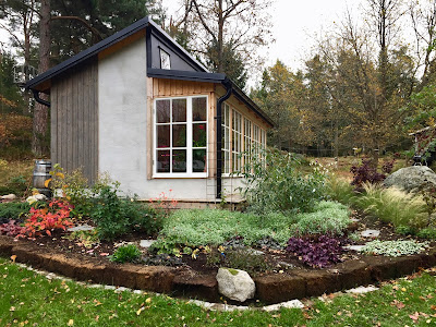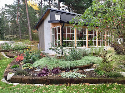 När jag tittar närmare ser jag att fjärilsbuskarna och höstastrarna fortfarande blommade då och att perukbusken till vänster har fått lysande höstfärg men annars ingen påtaglig förändring. Annat är det med alla andra rabatter som präglas av senhöstförfall. Dem väljer jag att blunda för idag...