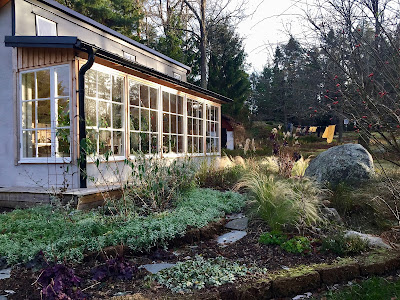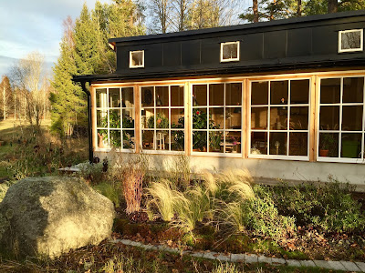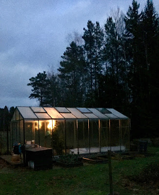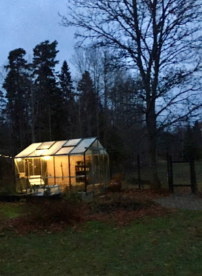 Temat i gårdagens Blommig Fredag var Advent i trädgården och idag satte Johan upp ljusslingor hopsnurrade till ljuskronor i växthuset - utomhus kan vi inte ha elsladdar liggande, gissa varför!